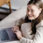 Featured Image Caption: Cheerful Woman Working on Laptop in Bedroom